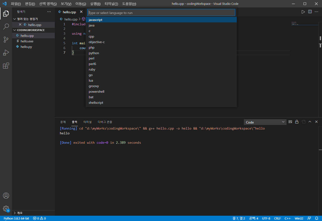 Code Runner가 지원하는 언어는 다음과 같습니다