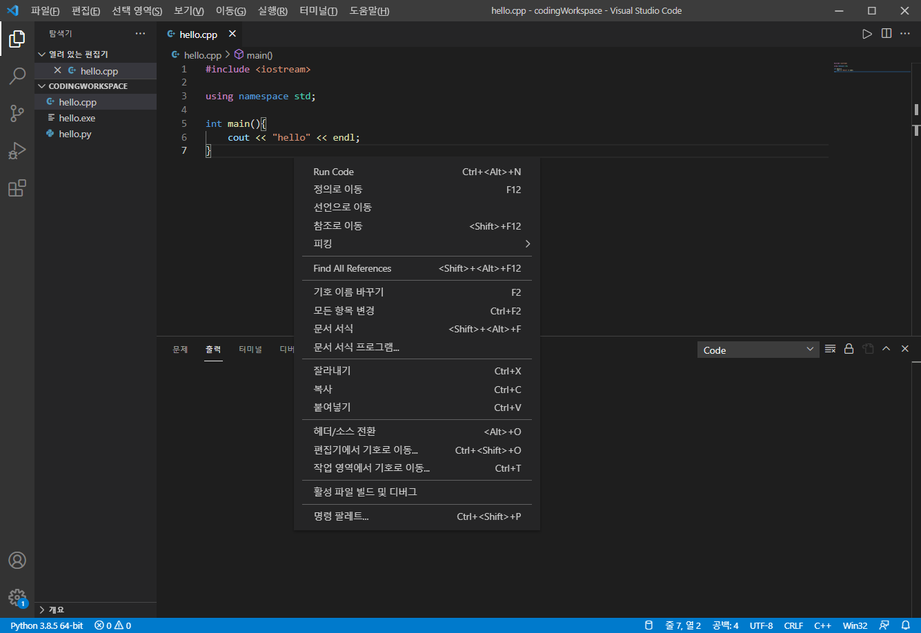 실행 중지 : 실행창 마우스 우클릭 > Stop Code Run