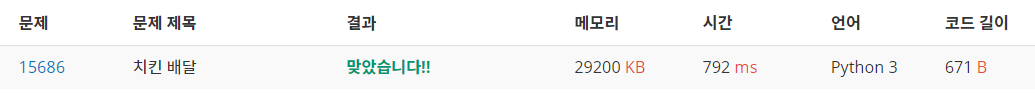 - itertools의 combinations를 이용하여 치킨집 리스트 chick에서 m개 선택하고, 치킨 거리 구하기!