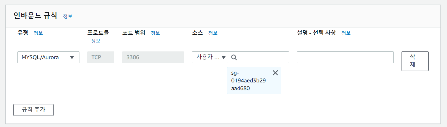 소스는 아까 기억했던 보안 그룹 선택