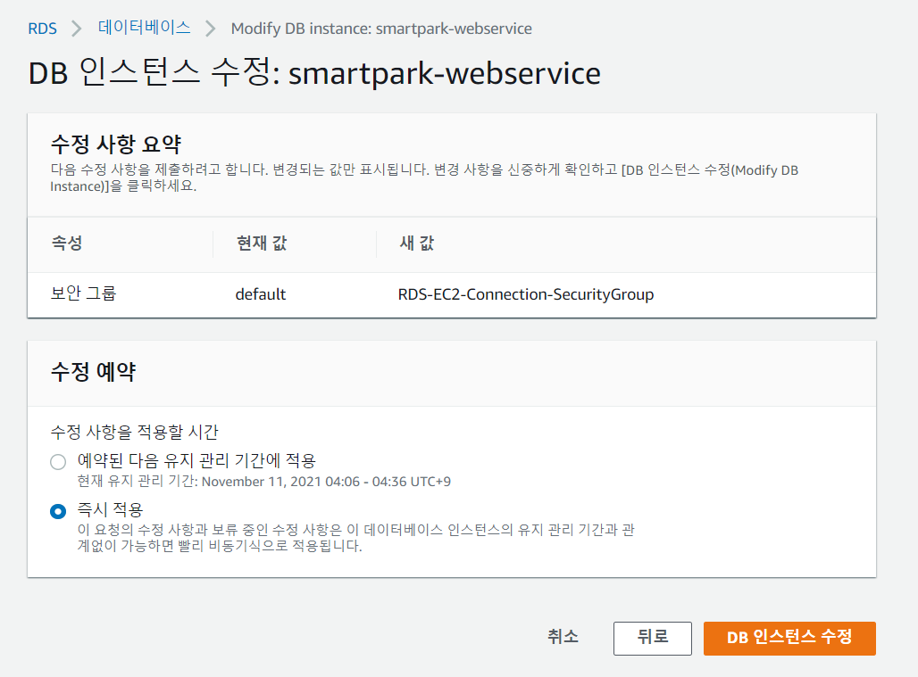3-4. 즉시 적용 선택 후 [DB 인스턴스 수정]
