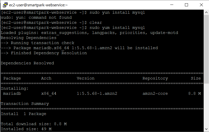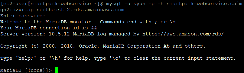 mysql -u syun -p -h smartpark-webservice.c5jmgn2iozvr.ap-northeast-2.rds.amazonaws.com