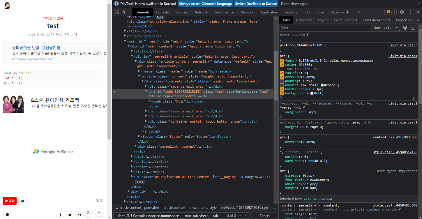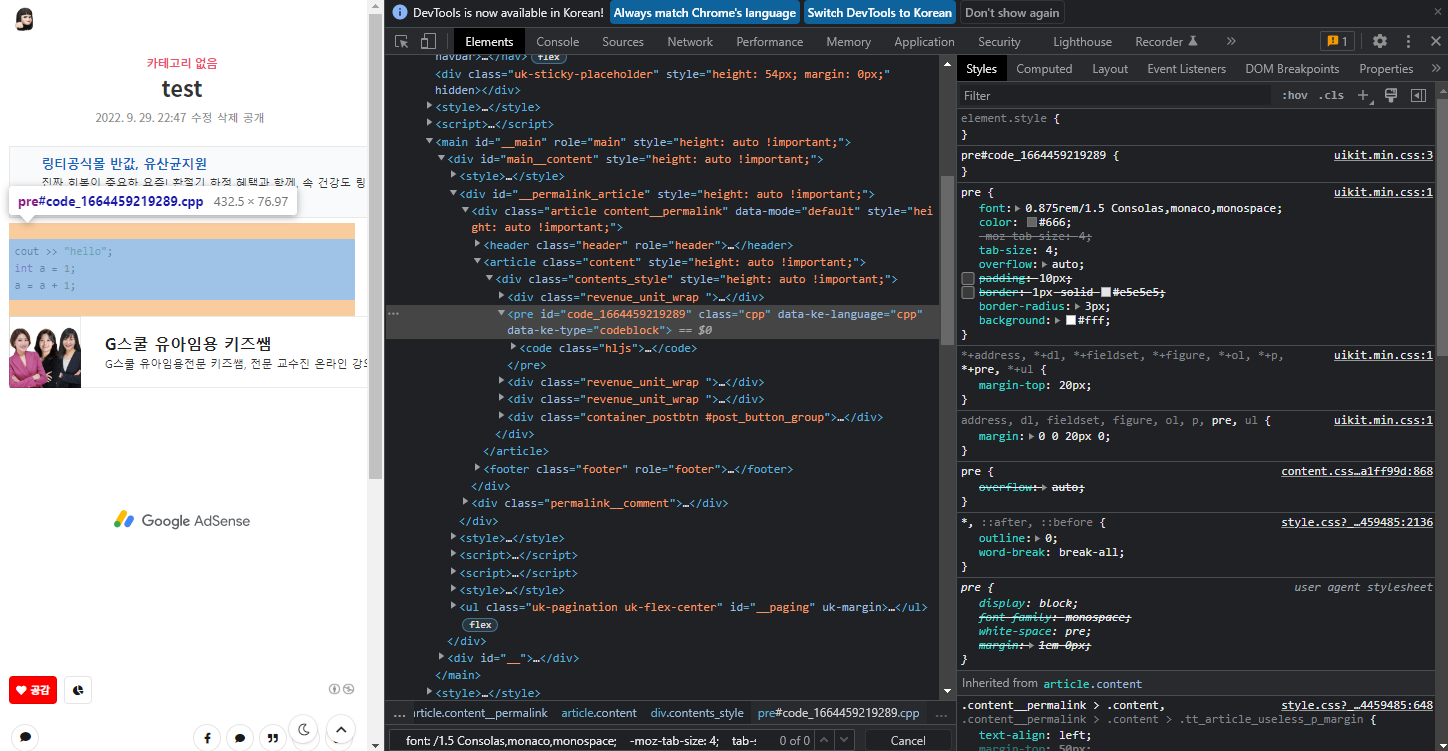 pre 태그가 붙은 부분을 클릭하면 테두리 영역과 관련된 Styles도 확인할 수 있습니다