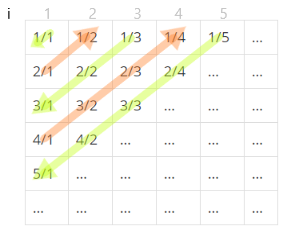 그림과 같은 방향으로 i번째 대각선에서는 i까지 분자가 증가합니다.