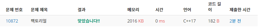 단계별로 풀어보기 - 재귀 단계 - [1단계] 10872번