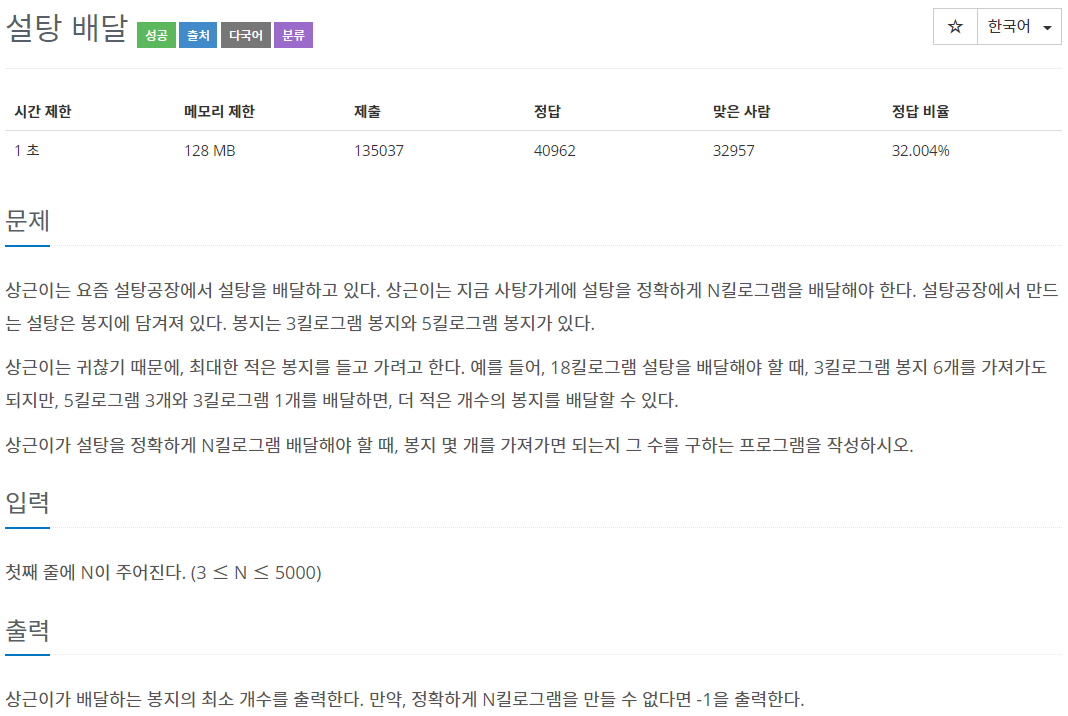 상근이는 요즘 설탕공장에서 설탕을 배달하고 있다. 상근이는 지금 사탕가게에 설탕을 정확하게 N킬로그램을 배달해야 한다. 설탕공장에서 만드는 설탕은 봉지에 담겨져 있다. 봉지는 3킬로그