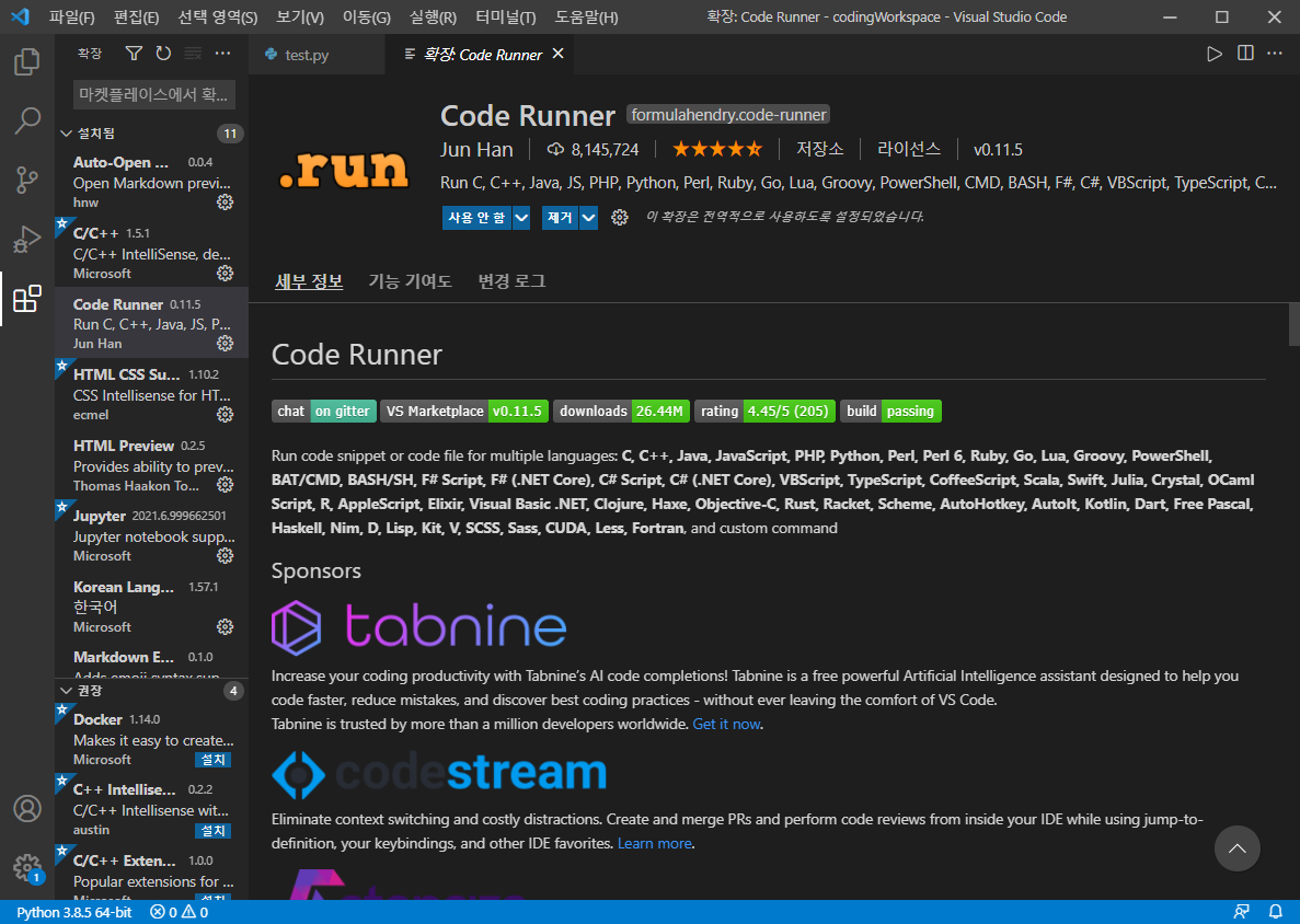 따라서 Code runner (코드 러너) 라는 확장 프로그램을 통해 편하게 실행할 수 있습니다!
