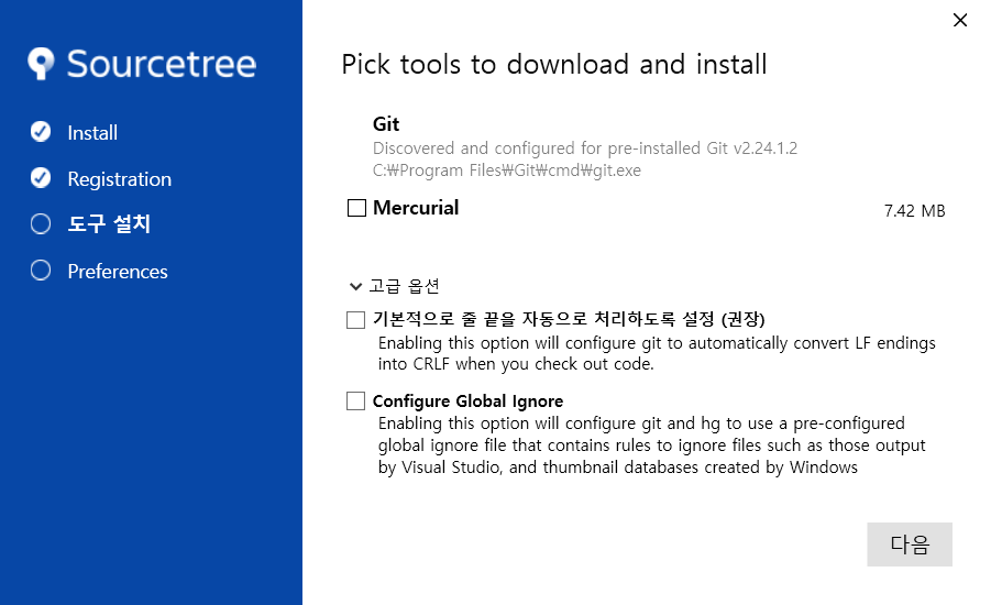 - Mercurial(분산 버전 관리 시스템, 필요한 경우 체크) 체크 해제 후 다음 클릭