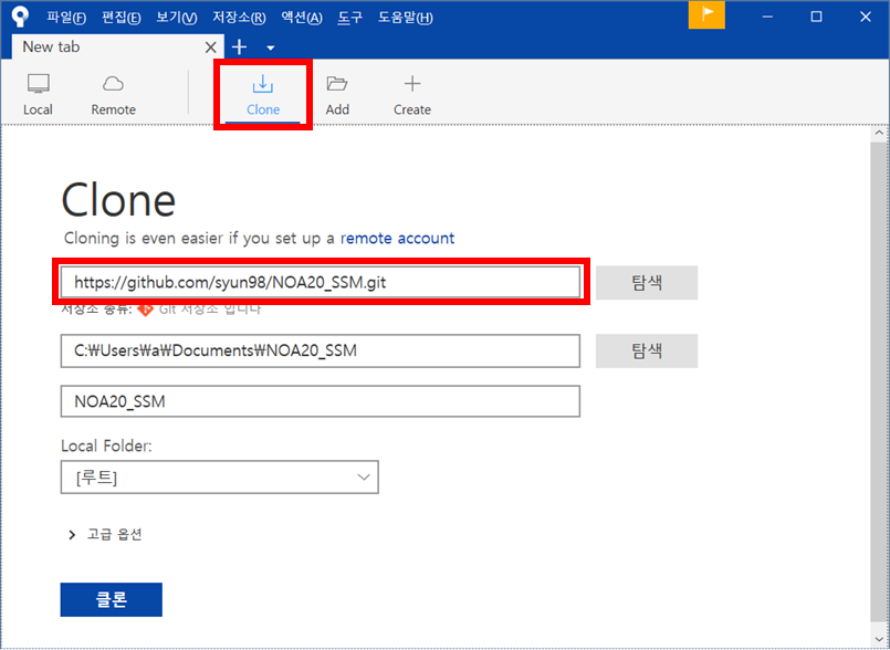 - Clone 메뉴를 선택하여 복사한 Repository의 주소를 입력, 저장할 폴더 경로를 선택하고 프로젝트명을 입력한 후, 클론을 클릭