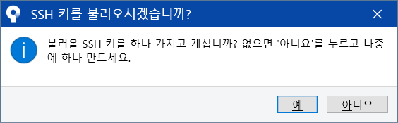 - SSH 키 보유하고 있다면 '예'를 눌러 등록, 없다면 '아니요'