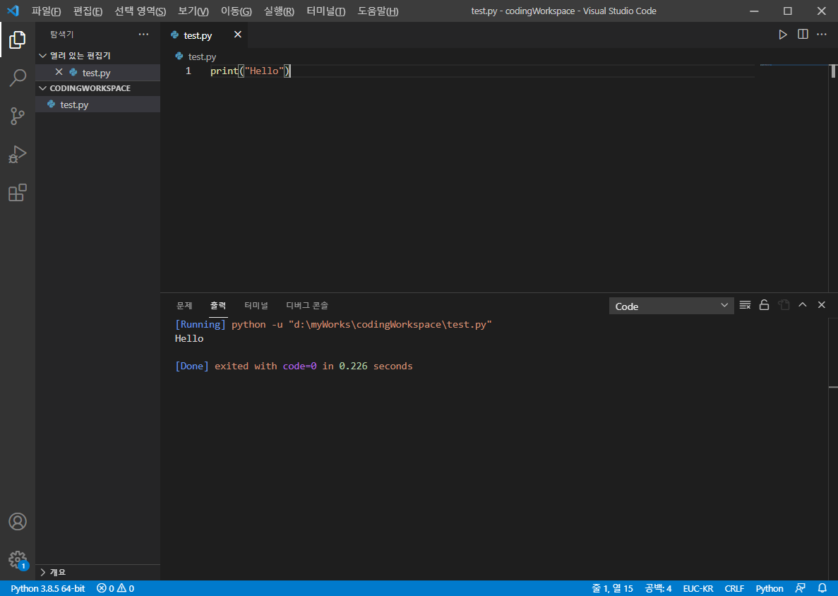 Visual Studio Code에서는 파이참과 같은 IDE와 달리 단순하게 빌드와 실행을 하기 어렵습니다