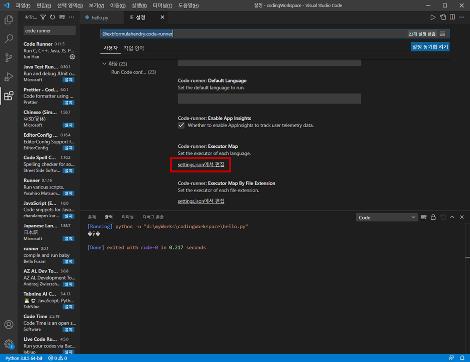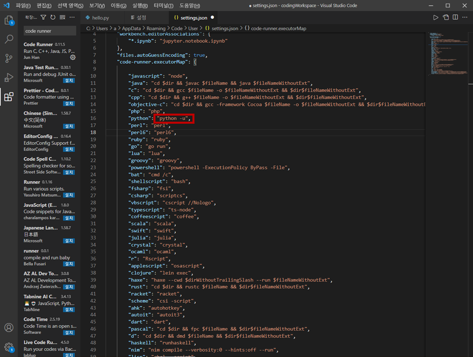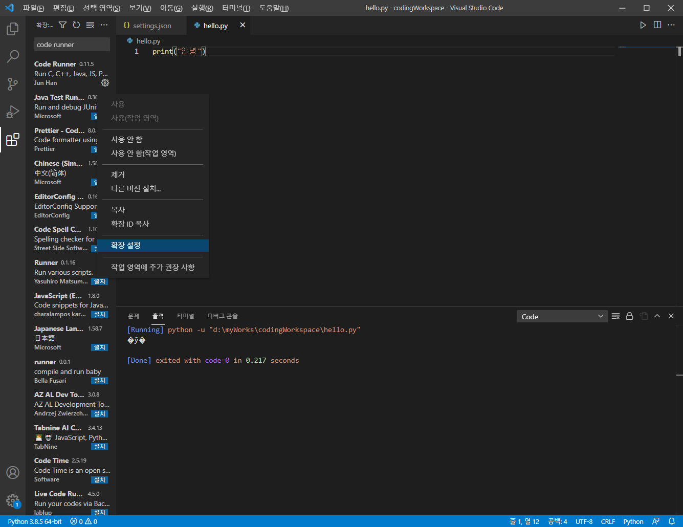 1. Code runner의 제어판 부분 클릭 > 확장 설정(Extension Setting)