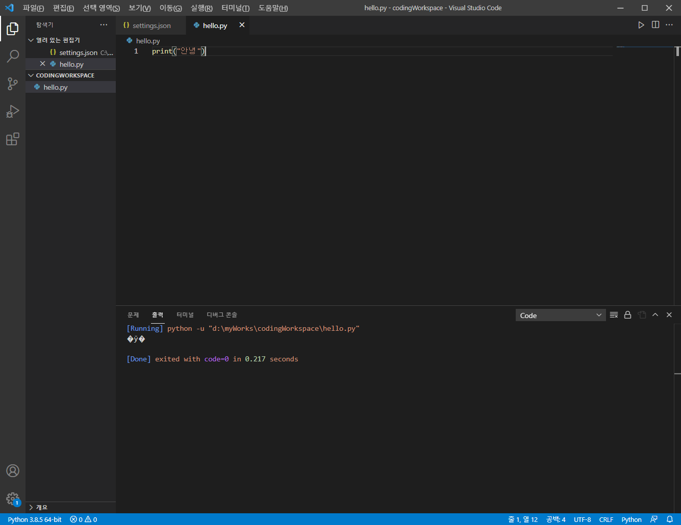 > 다음과 같이 출력에서 한글 깨짐이 발생하는 경우가 있다
