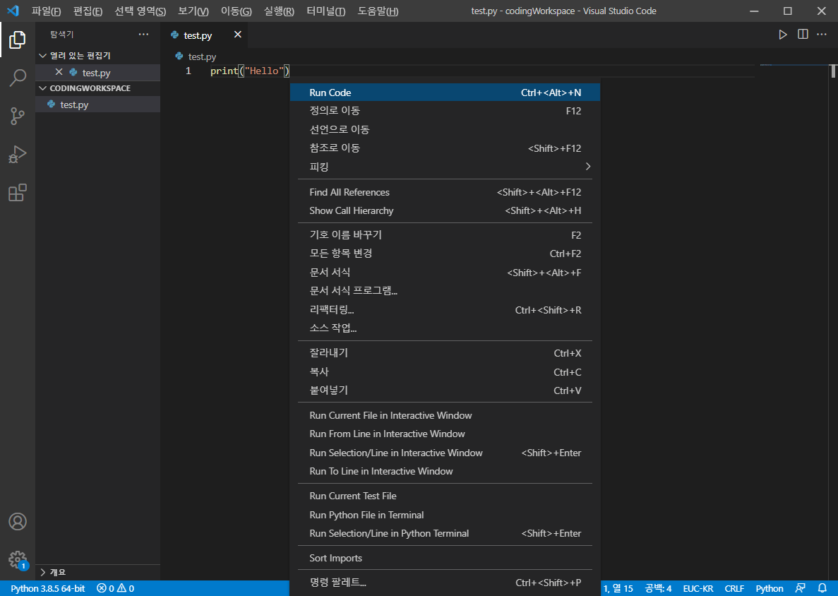 실행 중지 : 실행창 마우스 우클릭 > Stop Code Run