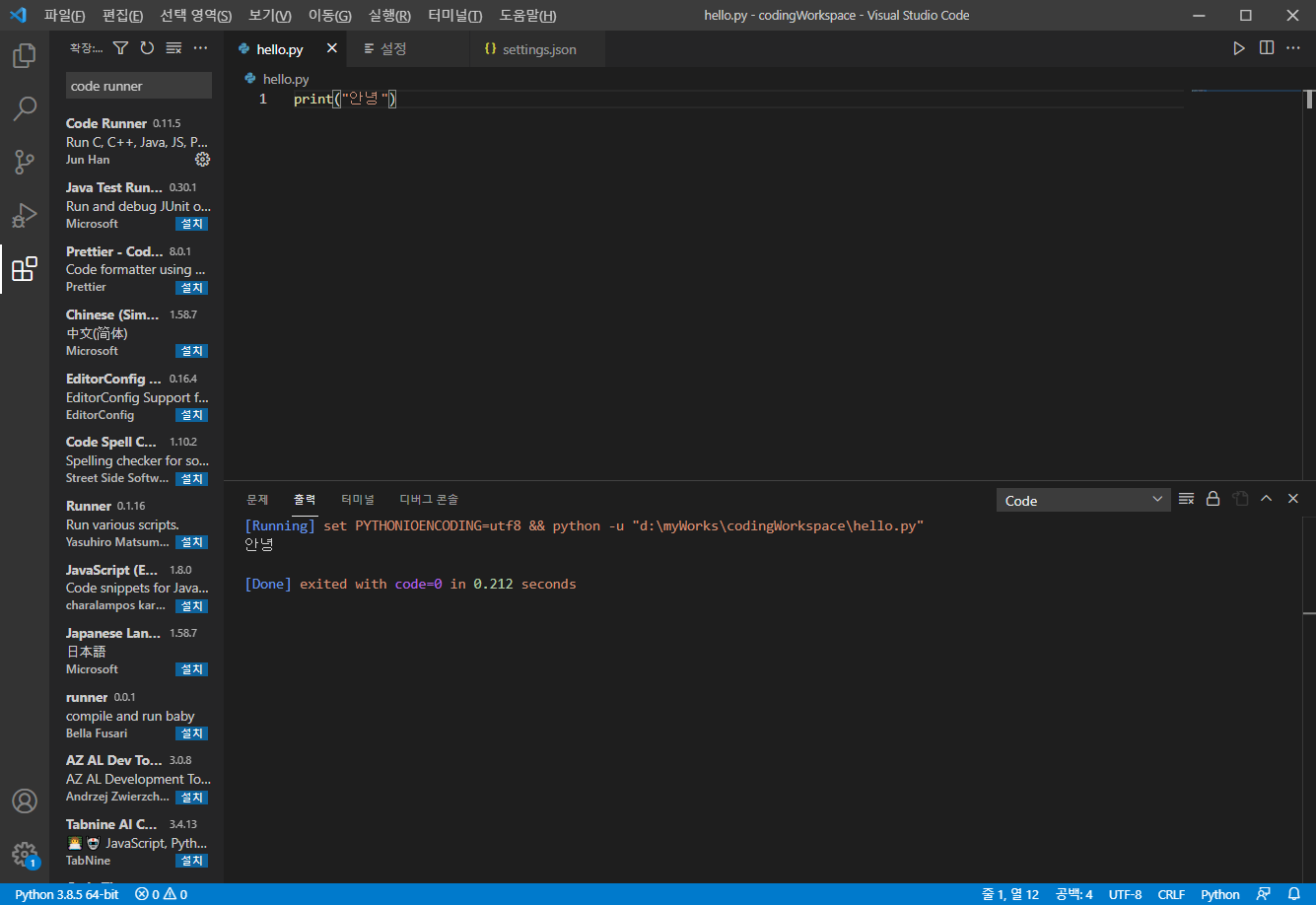 따라서 Code runner (코드 러너) 라는 확장 프로그램을 통해 편하게 실행할 수 있습니다!