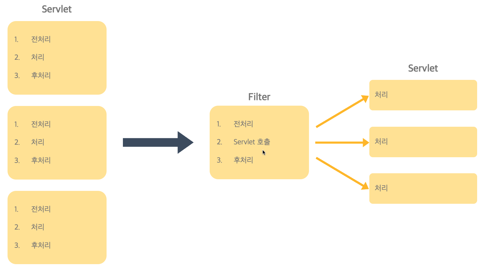 • Filter1 전처리 → Filter2 전처리 → Servlet → Filter2 후처리 → Filter1 후처리